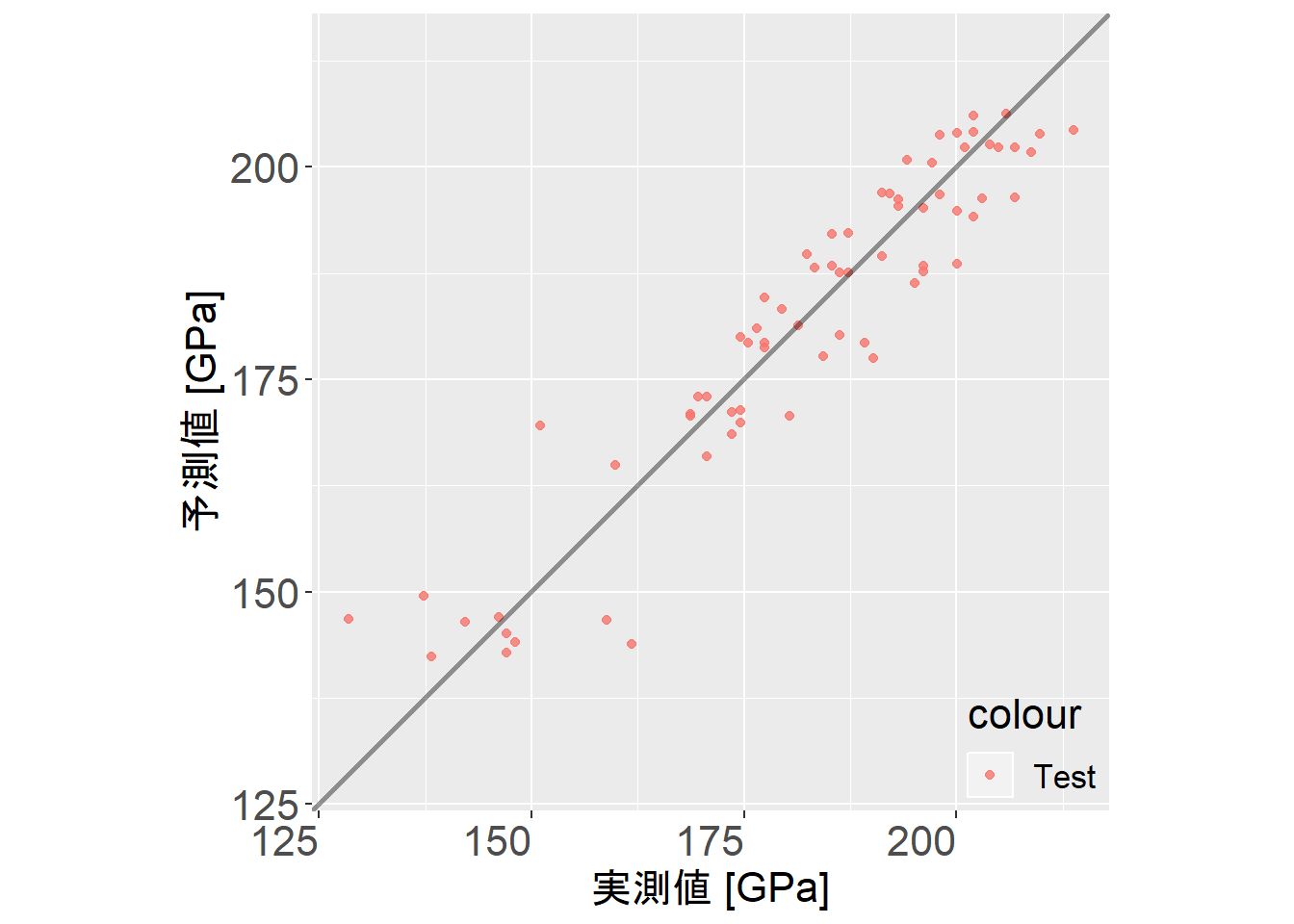 本ワークフローに実装された機械学習モデルについて述べる。 文献 1 に示された12鋼種の実験データを用いて、 温度と元素含有量に基づくヤング率を予測するモデルを構築した。 尚、引用文献では一部の鋼種にCbなる元素が含有されるがこれはNbの別称である。今回のモデル構築では変数名をNb_Cbとした。 学習手法にはRandomForestの一種であるrangerを使用し、少データに対応するため Leave-One-Outによるハイパーパラメータチューニングを行った。 モデルの評価指標を 表 42 、実測値・予測値のプロットを 図 342 に示す。