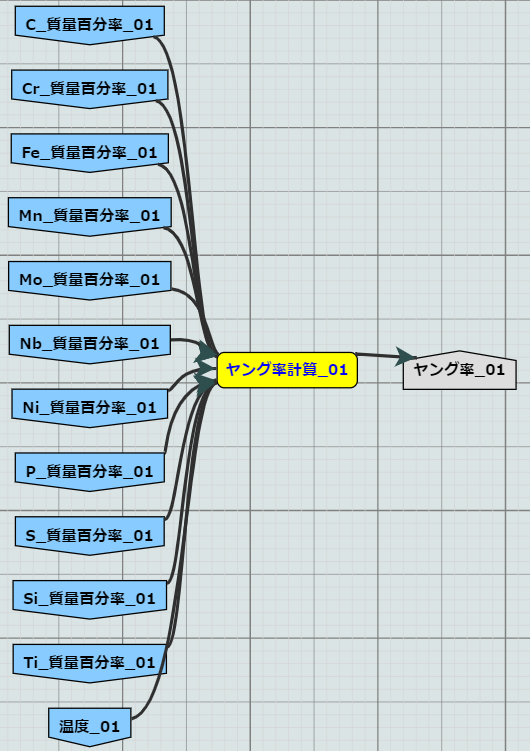 機械学習モデルを利用して鋼材の組成[wt%]と温度[K]からヤング率[GPa]を予測する。
